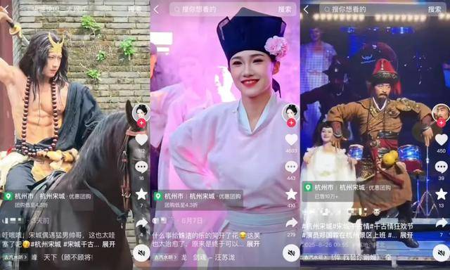在千古情景区,随处可见走动式表演与快闪秀,你可以看见骑马走天涯的腹肌猛男,以古装舞蹈收获百万点赞的甜美歌姬,以着装与舞蹈反差走红网络的“宋城林冲”……